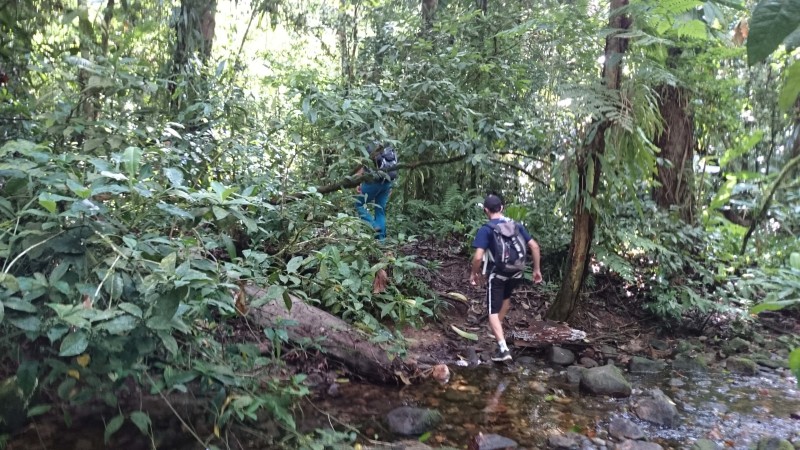 Após revisar e reorganizar as mochilas e equipamentos, partimos rumo ao pico às 8:50h. O caminho inicial é bem tranquilo, basta seguir em frente pela larga rua de terra. Ao seu final seguimos à direita (seguindo um pequeno córrego), que mais a frente desagua em outro. Atravessamos este outro (havia alguns apoios de bambu para atravessar) e seguimos por uma trilha quase encoberta pela vegetação, mas ainda visível. Poucos metros mais à frente pegamos um entroncamento à esquerda e então adentramos na mata, com a trilha melhor demarcada.